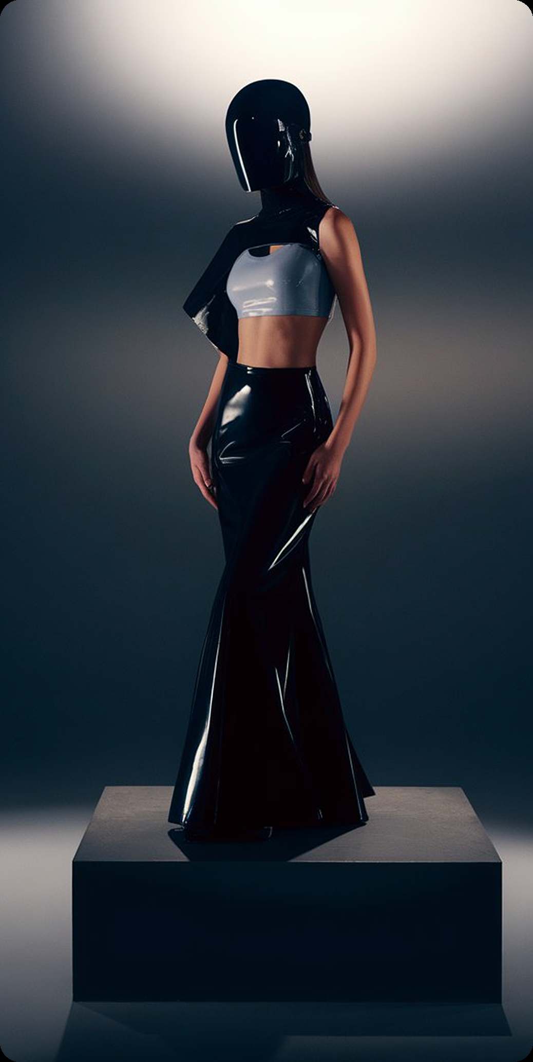 A stylish female model with short black hair, wearing a strapless black dress, photographed in a glossy tiled room with dramatic lighting.
